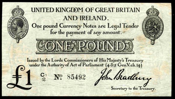 However, the Government issued Treasury banknotes (to the value of £1 and 10 shillings) to replace the gold sovereign. Paper money during the First World War replaced gold for internal use only after 1915. Nevertheless, the branch mints in Australia and South Africa (the main Commonwealth gold producing countries) continued striking sovereign until 1930-2.